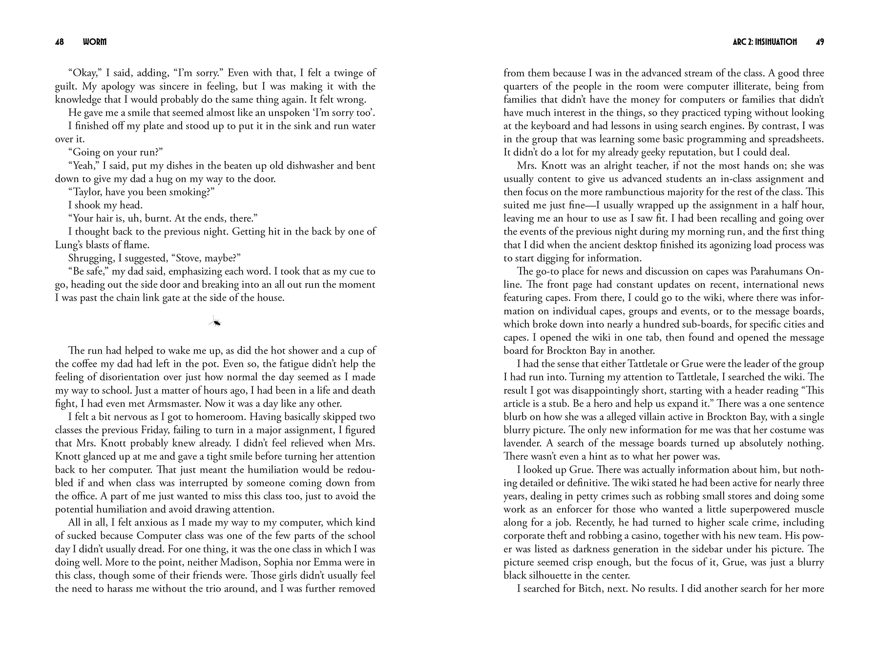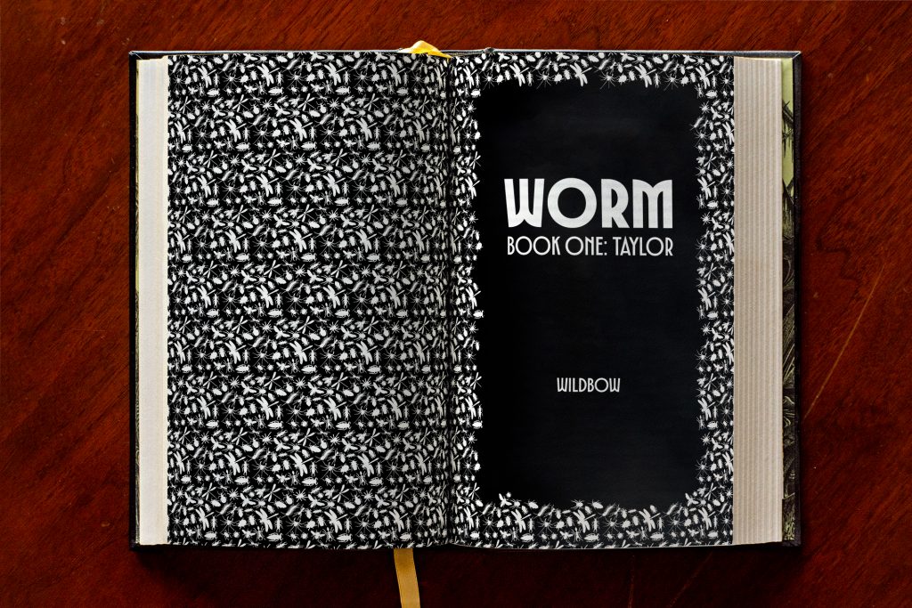 Worm is a first-person superhero epic by John C. “Wildbow” McCrae following Taylor, a highschool girl with the power to control bugs and other simple life-forms. It was self-published online serially from 2011-2013, concluding with a final word count of almost 1.7 million and reaching a readership of hundreds of thousands. As a personal project to learn and practice interior design, or typesetting, I decided to bring this never-published-in-print serial — and dear to me story that I have read “cover” to “cover” multiple times — to life.